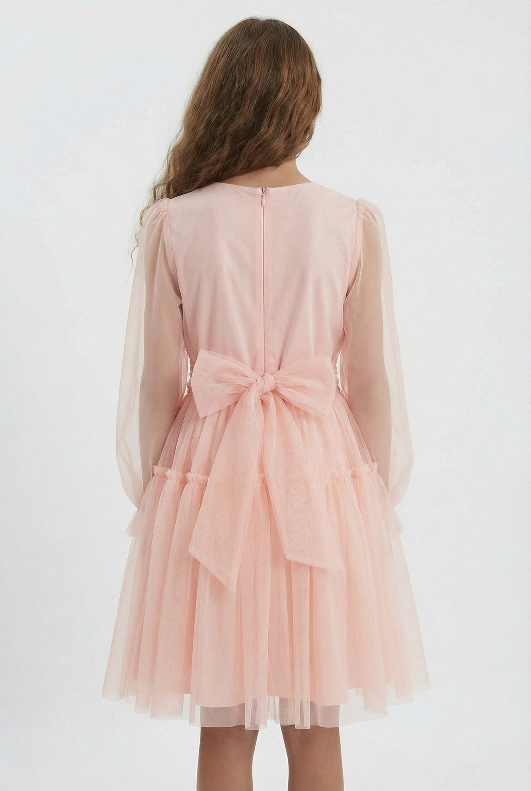Suknelė Holly abrikosų rožinė - tai švelnumo ir grožio įsikūnijimas, sukurtas mažosioms damoms, kurios mėgsta ryškias ir šiltas spalvas. Subtili abrikosų rožinė tiulio spalva primena saulėlydžio tonus ir suteikia suknelei pasakišką žavesį. Ilgos rankovės ir medvilninis pamušalas užtikrina komfortą bet kuriuo metų laiku.
